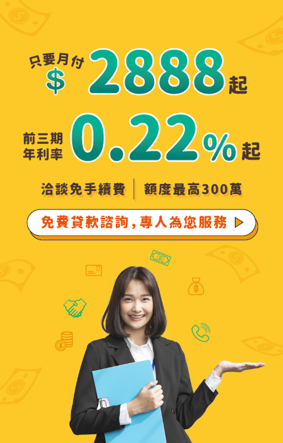 註2:以上所有貸款方案之總費用年百分率不等於貸款利率,實際貸款條件 (例:核貸金額、利率、月付金、帳管費、手續費、票查費、提前清償違約金、信用查詢費、開辦費…等) 視個別銀行貸款產品及授信條件不同而有所差異,銀行保留核貸額度、適用利率、年限期數與核貸與否之權利,詳細約定應以銀行貸款申請書及約定書為準。